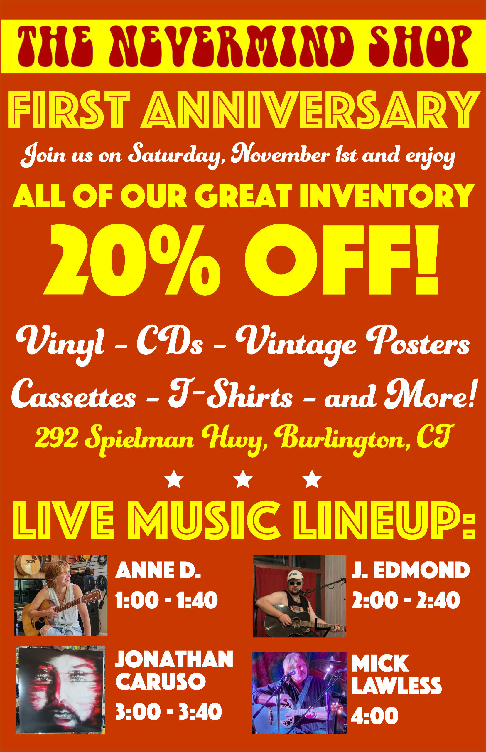 On November first, 2025, we celebrated the first anniversary of The Burlington, CT store with a great day of live music and discounts. That afternoon saw performances by Anne D, J. Edmond, Jonathan Caruso, and Mick Lawless, right here in the shop.